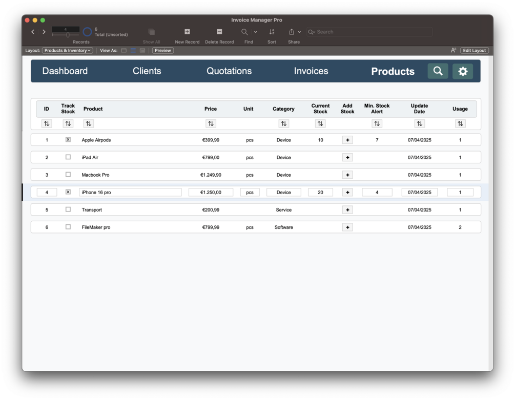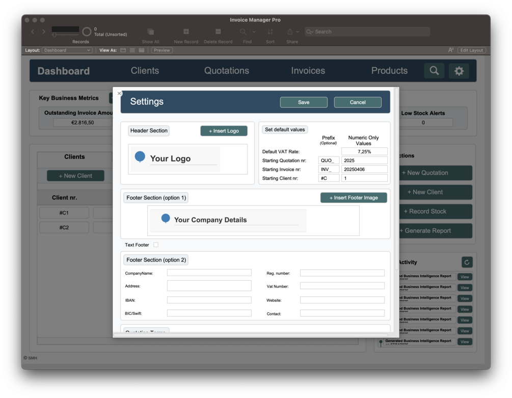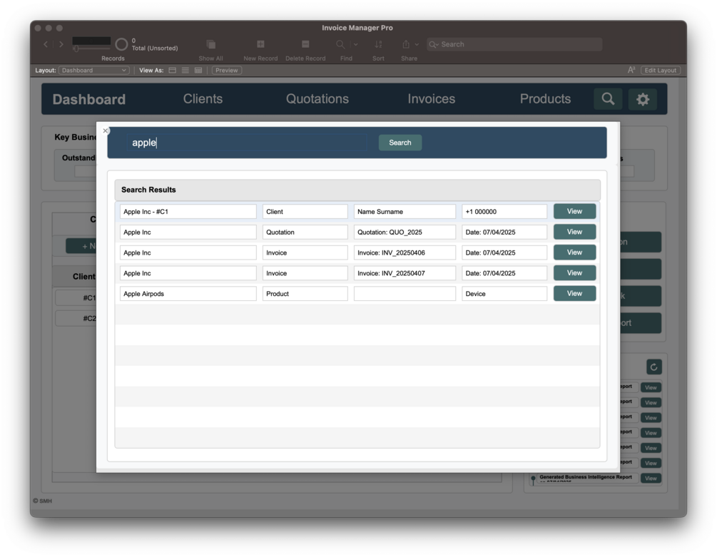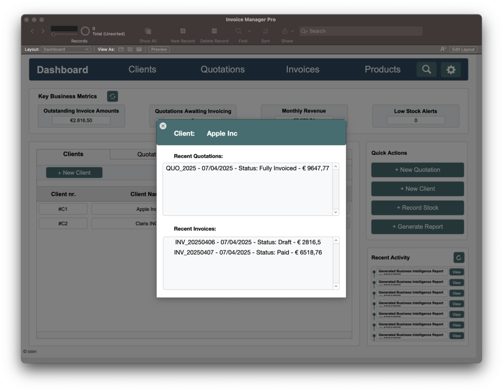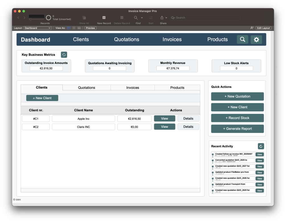 Invoice Manager Pro FM is a comprehensive business management solution built on the Claris FileMaker Pro platform. This professional system seamlessly integrates client management, quotation creation, invoicing, product & inventory control, and business intelligence dashboard into one powerful package.
