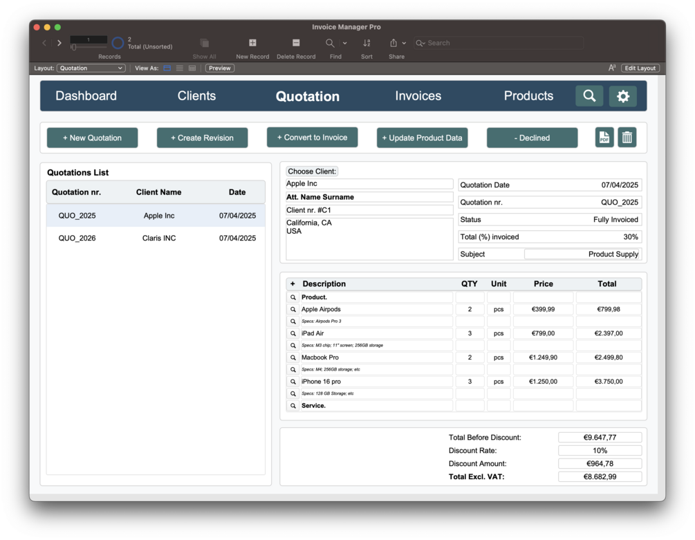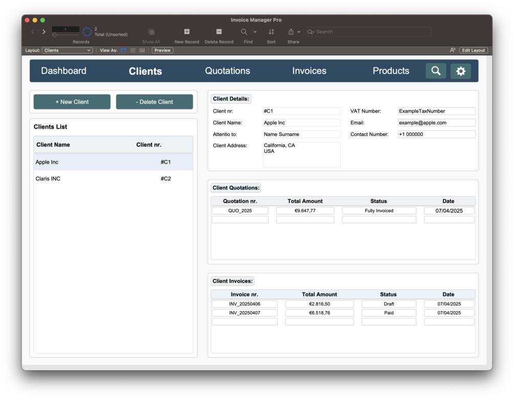 Designed for growing businesses seeking efficiency and professionalism, Invoice Manager Pro FM eliminates double-entry and streamlines your entire sales process from initial client contact to final payment.