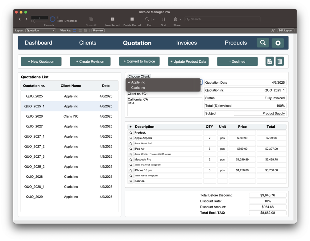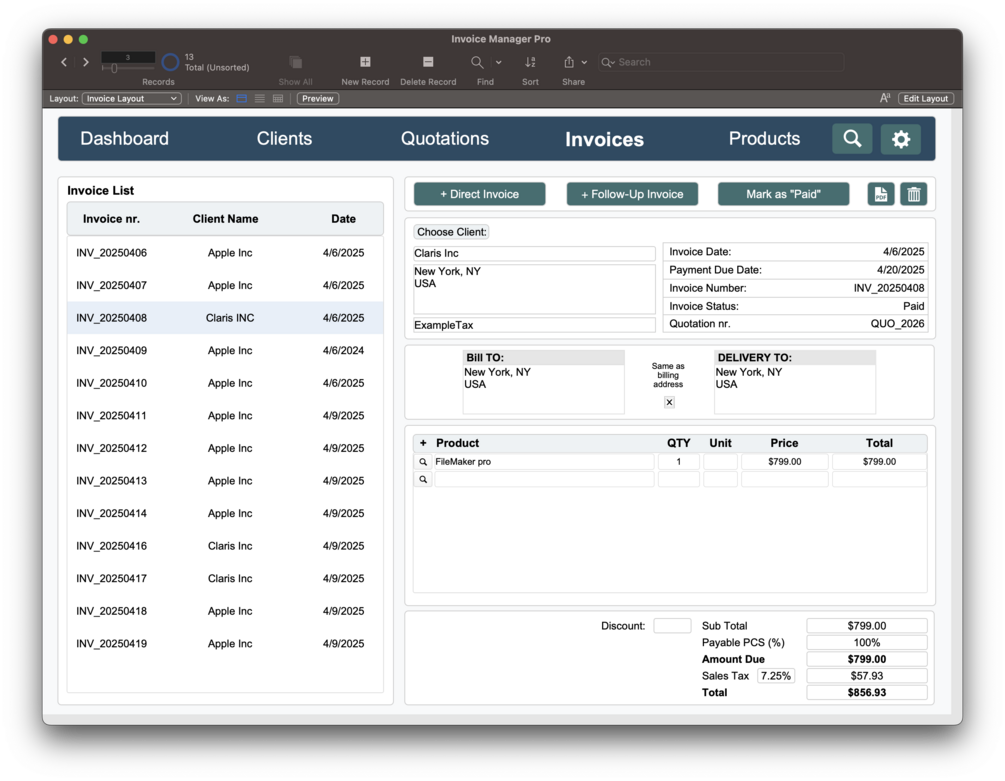 Designed for growing businesses seeking efficiency and professionalism, Invoice Manager Pro FM eliminates double-entry and streamlines your entire sales process from initial client contact to final payment.