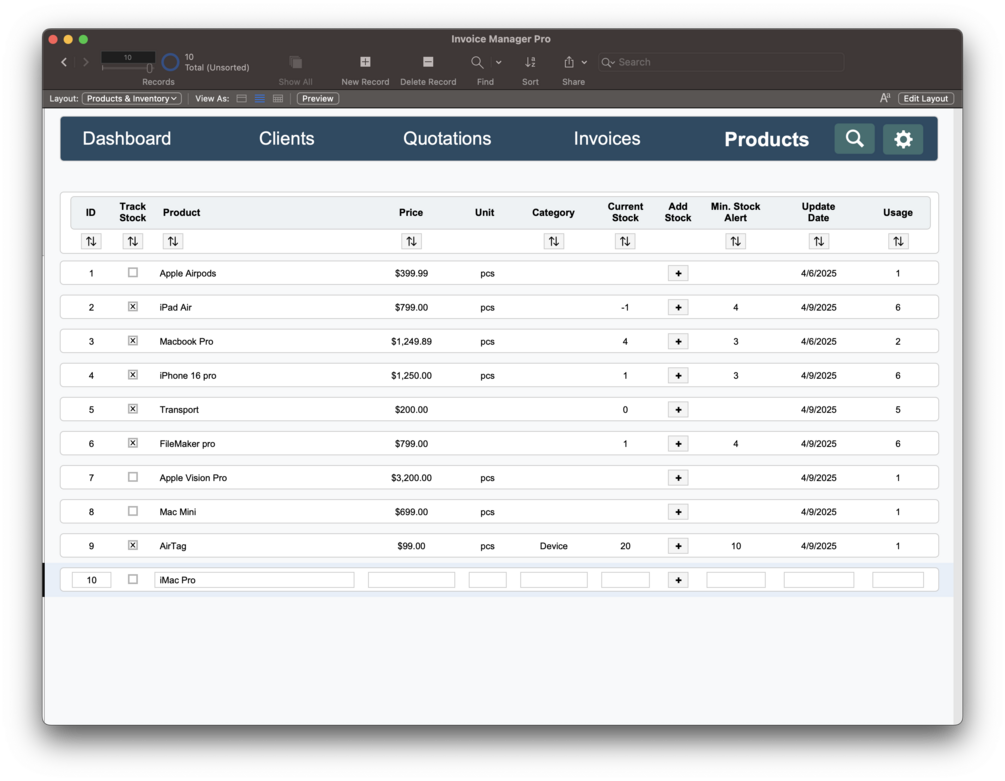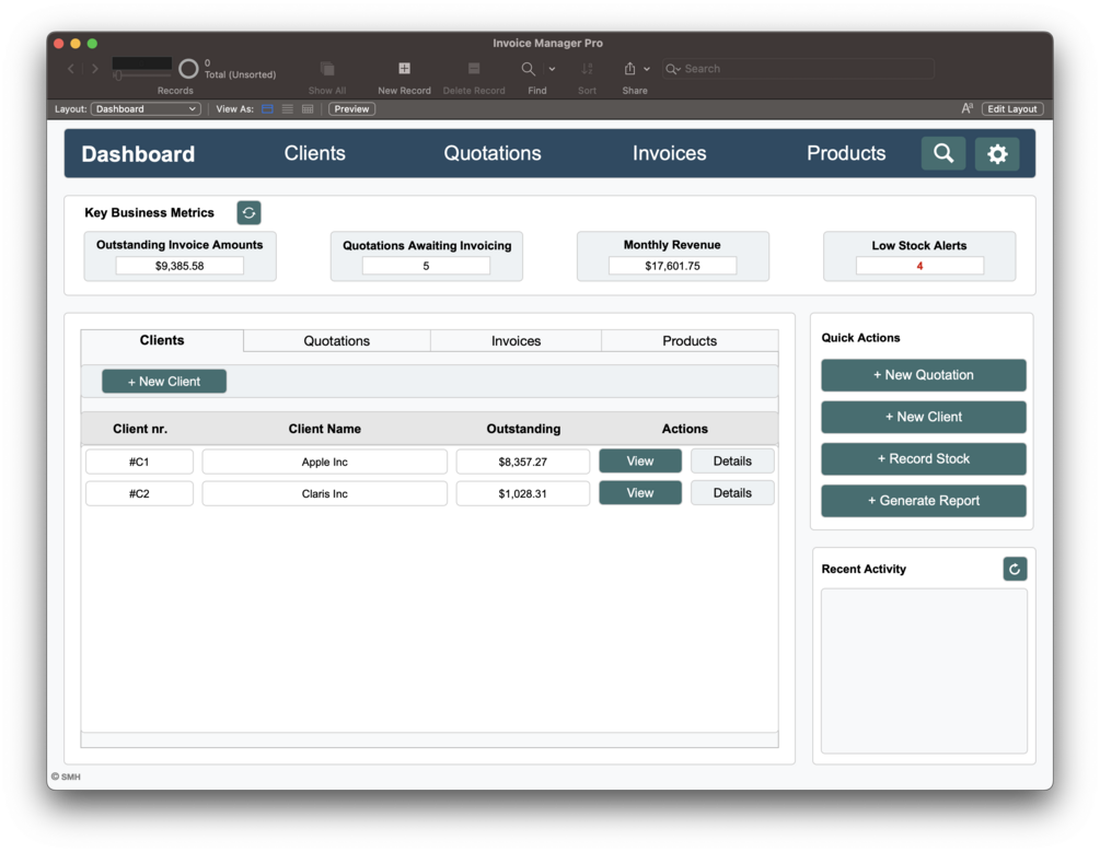 Invoice Manager Pro FM is a comprehensive business management solution built on the Claris FileMaker Pro platform. This professional system seamlessly integrates client management, quotation creation, invoicing, product & inventory control, and business intelligence dashboard into one powerful package.